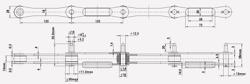 不锈钢链条、自润滑链条、破断载荷55KN;更多节距的型号可供选择:P63.5、P95.25、P127、P150 等