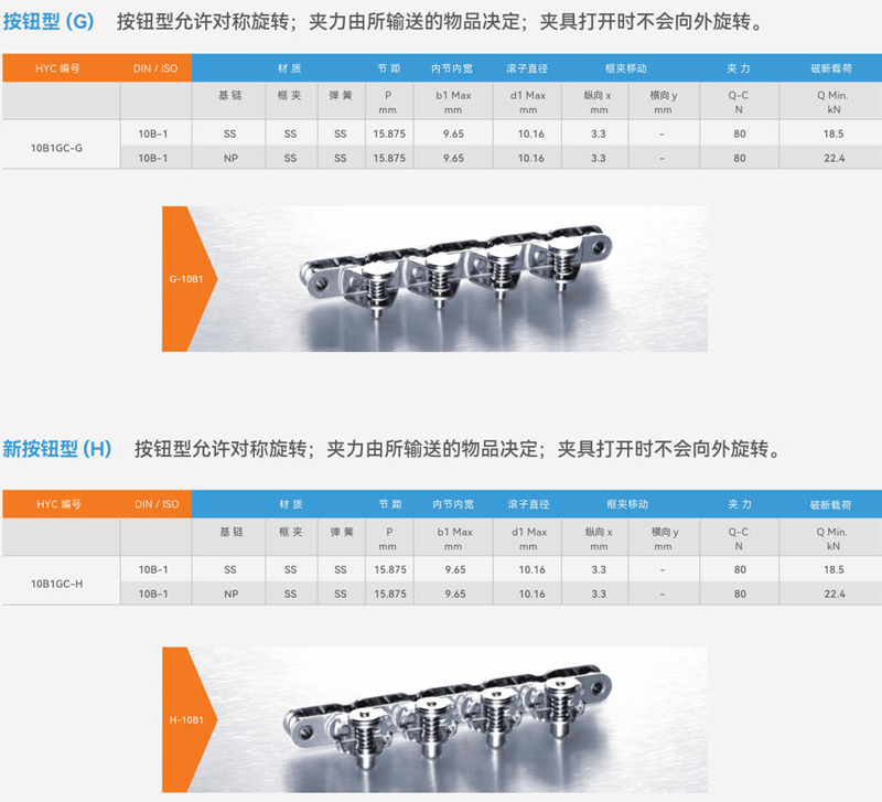 HYC夹膜链的不锈钢弹簧采用日本进口材料制造,如终确保链条的夹力;